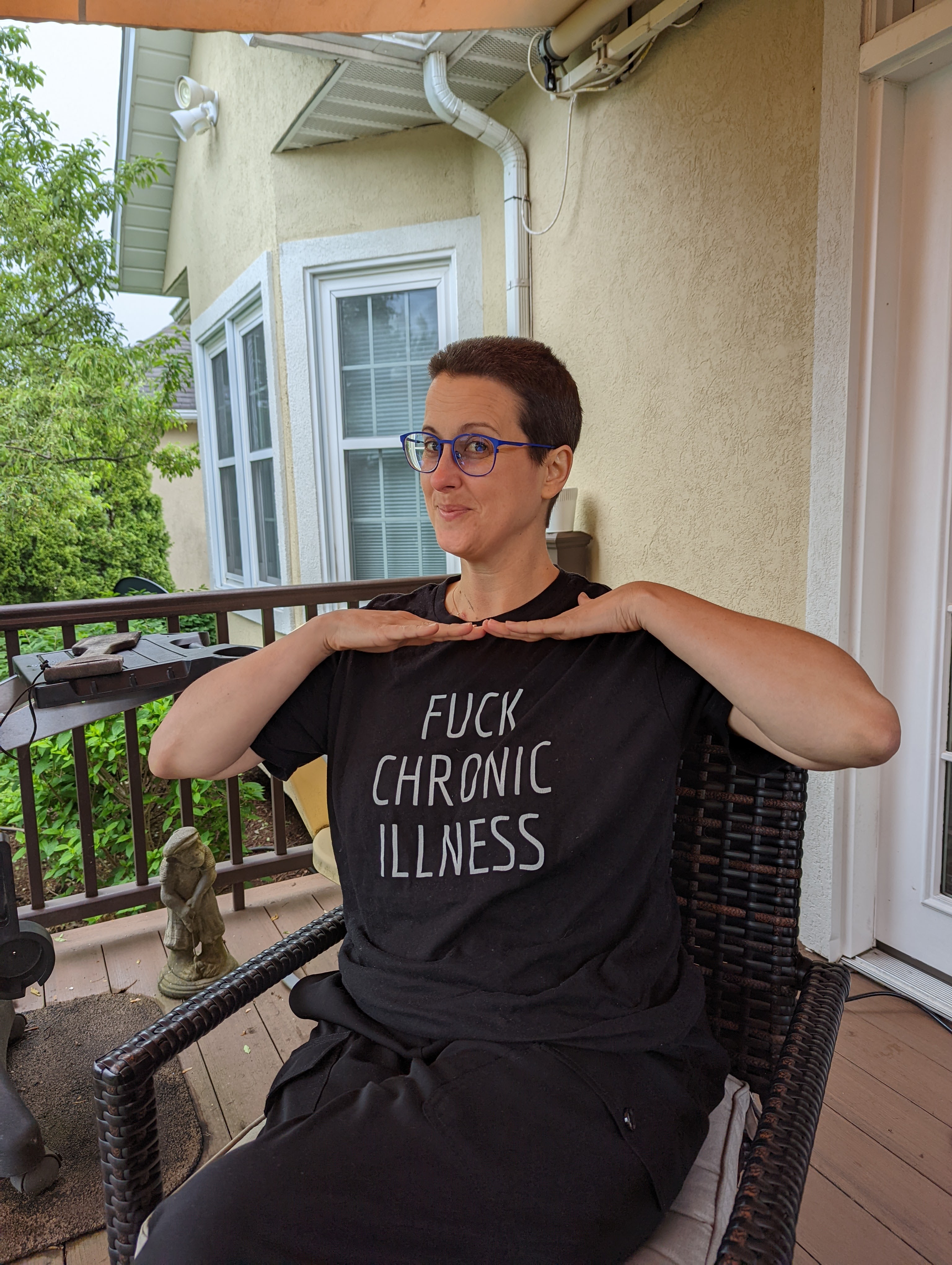 So over the last few years I’ve come to terms with having a limp. Initially, colleagues asked if I sprained my ankle or if something was wrong and I smiled, shoved my tears down and answered that I was fine. I began to walk MUCH slower. For those who know me, I used to be a speed racer, so the change was drastic and noticeable. Then I started using canes and now rollators. So you see, I have outward signs of disability. I’ve battled my demons, my pride, my worth and come to terms with these things. I already present “other” to the world and I’m not scared or ashamed. I use things that help me stay mobile and I’m ok with my physical representation of disability. So a shaved head doesn’t define me as healthy or ill, it’s just a shaved head.