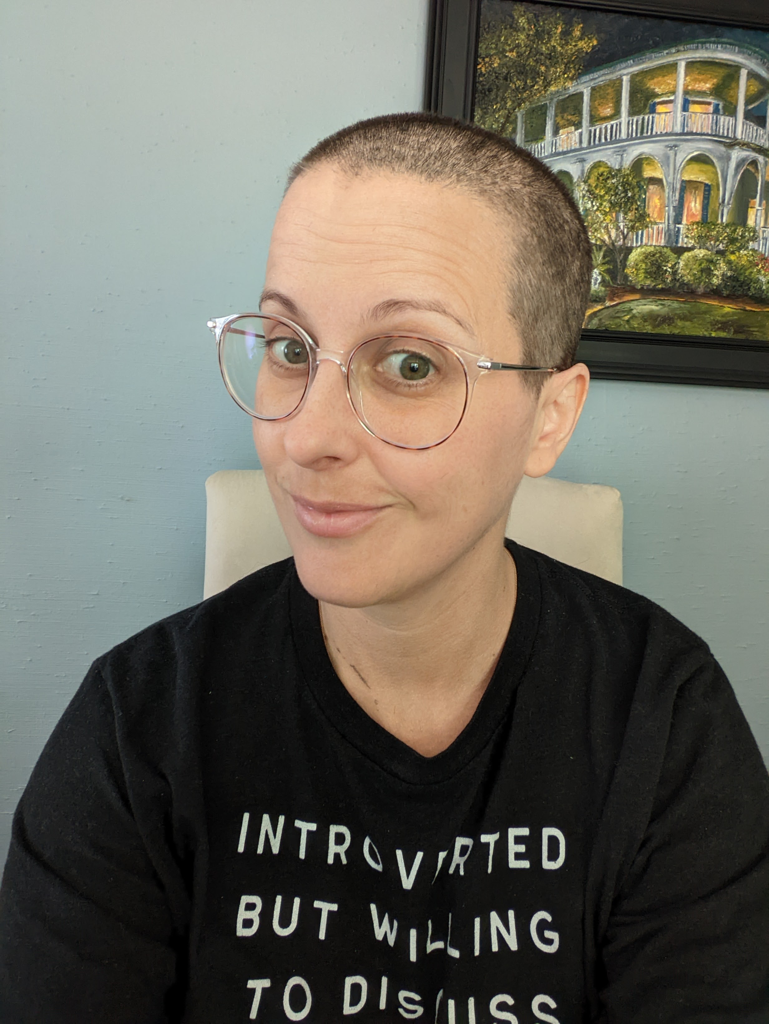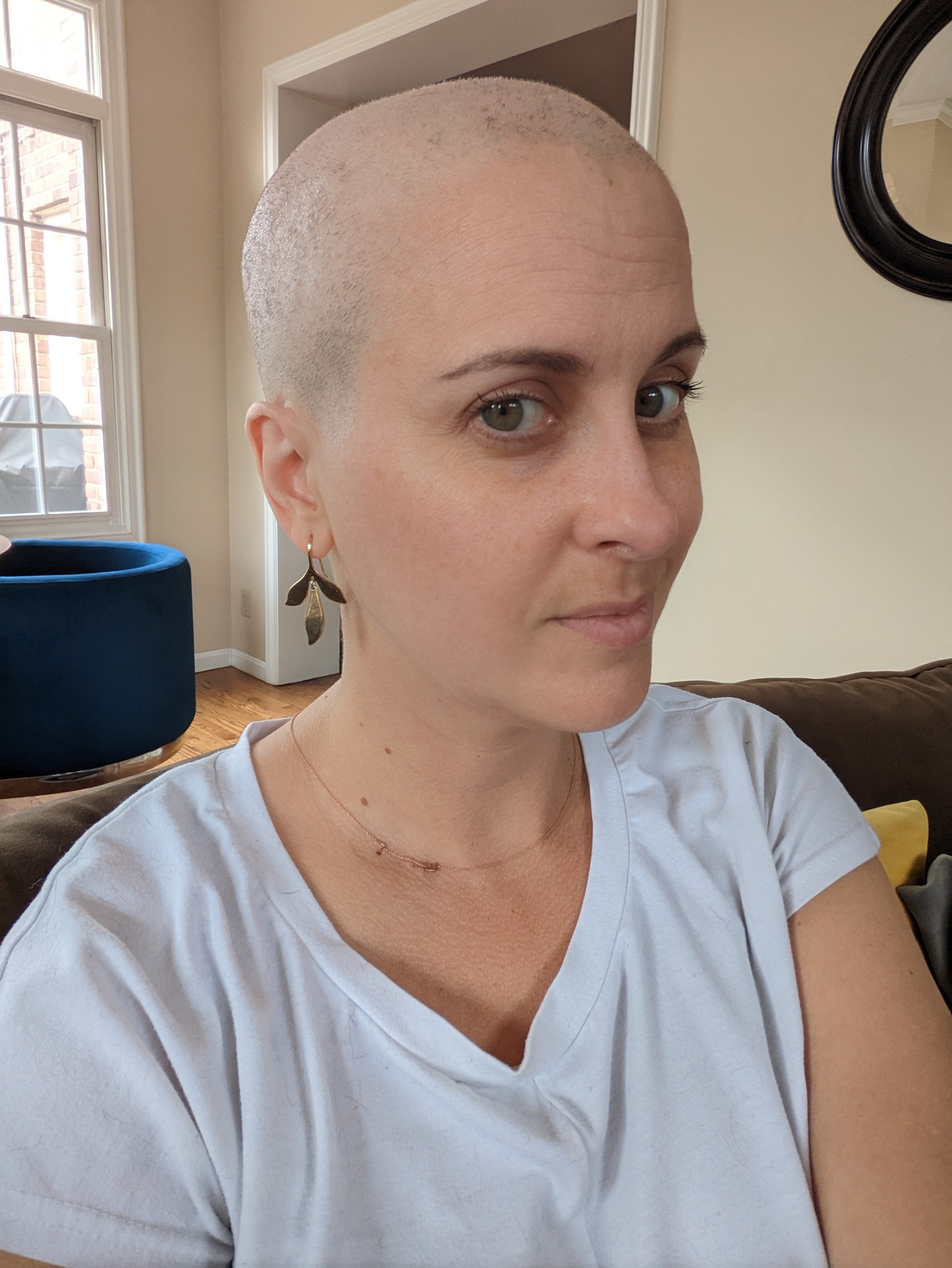 My hair was chin length and we shaved it short. You can watch a fun reel my dear friend put together on Instagram. A few days later, my hair was falling out in droves. We shaved it shorter. Still, touching my head brought hundreds of hairs away each time and there’s only so much shedding I could blame on my dog. So I shaved it all, I’m bald.