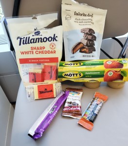 The first time I was with Carolyn at the hospital I was woefully unprepared. This was the week following her first dose of chemo when she was headed to Taussig Cancer Center at Cleveland Clinic daily to check her blood levels and receive supportive care such as fluids or potassium. I walked to the food court to get us some lunch which was no big deal that first day. By the second day however, I was much better prepared with a variety of snacks to offer Carolyn depending on her nausea and what sounded good. The individually wrapped sharp cheddar cheese was a huge hit! Sometimes, having a little something was better than running for lunch. Full disclosure, I ate most of the chocolate.