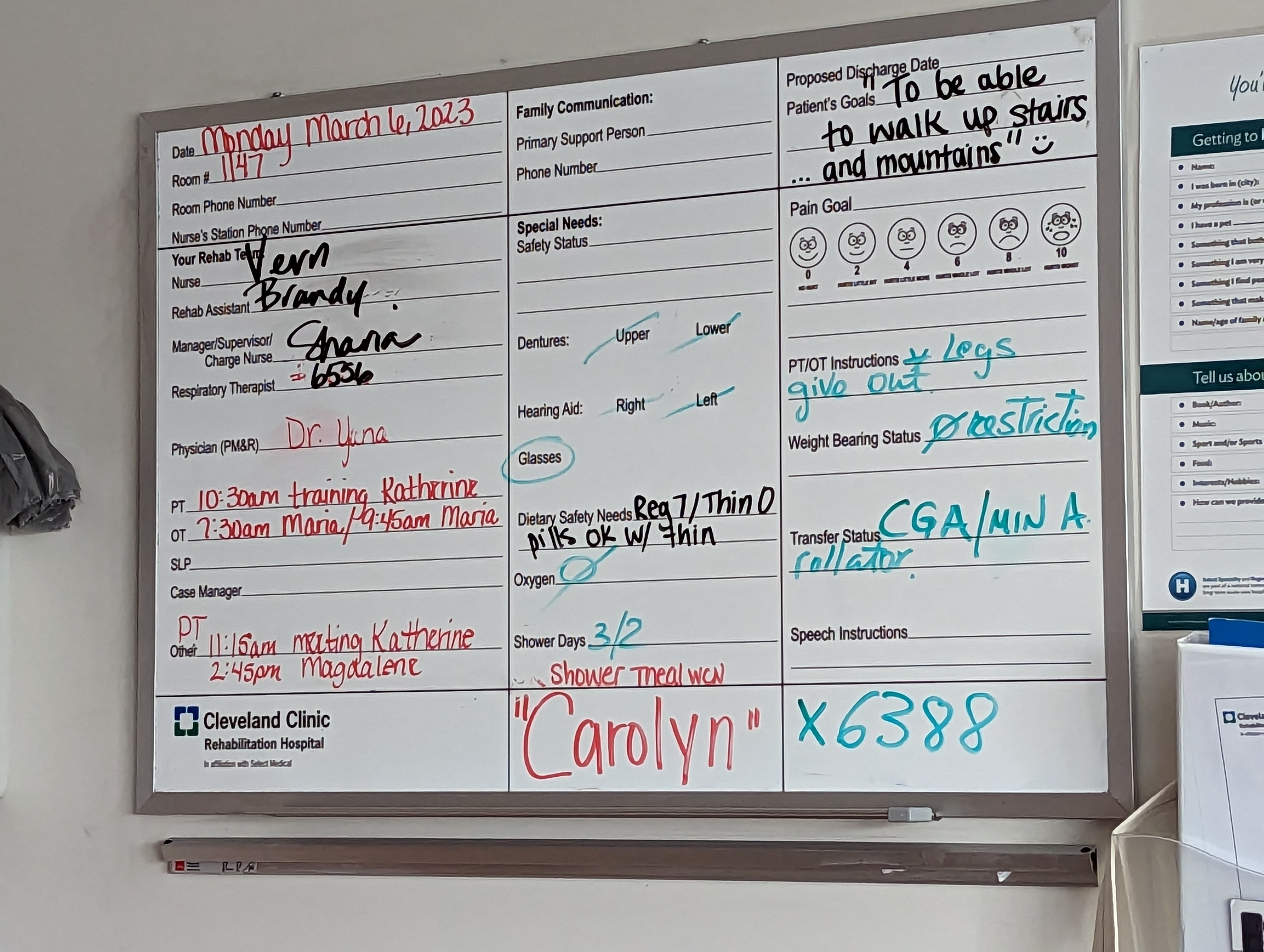 March was heavy. It started with unexpected additional disability leave from work, a stint in rehab to relearn to walk, and a struggle to take stairs, figure out life, navigate debilitating depression, and work through trauma. Please note my goal as printed on the white board in my room at rehab: “To be able to walk up stairs… and mountains.” I will never be satisfied with good enough, or ok. I have mastered the art of realistic expectations and stretch goals. Despite this very hard month, I also got my first haircut since transplant, was able to bike for 18 minutes, met a therapy dog named Sunshine, and learned that mental health is as deserving of time, attention, and healing as my physical health.